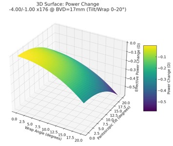 Fig 1 shows the effect of both tilt and wrap on the effective powers (as the patient would perceive the lens) in the absence of appropriate compensation for position of wear. Note that this does not include the additional confounding factor of BVD change.