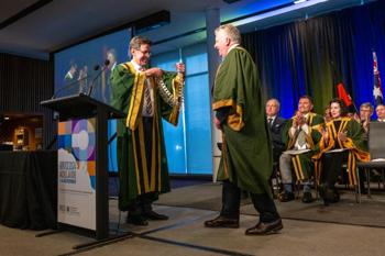 Outgoing RANZCO president Dr Grant Raymond hands over the presidential chain of office to new RANZCO president Prof Peter McCluskey