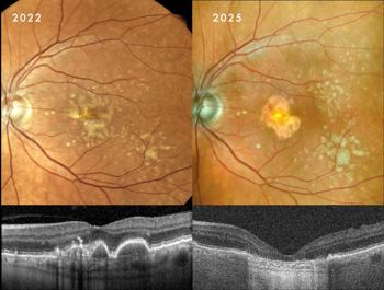 Clinical presentation: A 60-year-old woman presented with large, central drusenoid PEDs in both eyes. Natural history data indicate that the resolution of such lesions is almost invariably accompanied by atrophy of the underlying RPE and overlying photoreceptors.