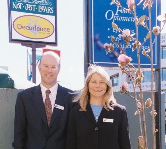 Optometrists Jonathan and Michelle Foate in 2001, outside their original Victoria Street premises, which fell victim to the Christchurch earthquakes