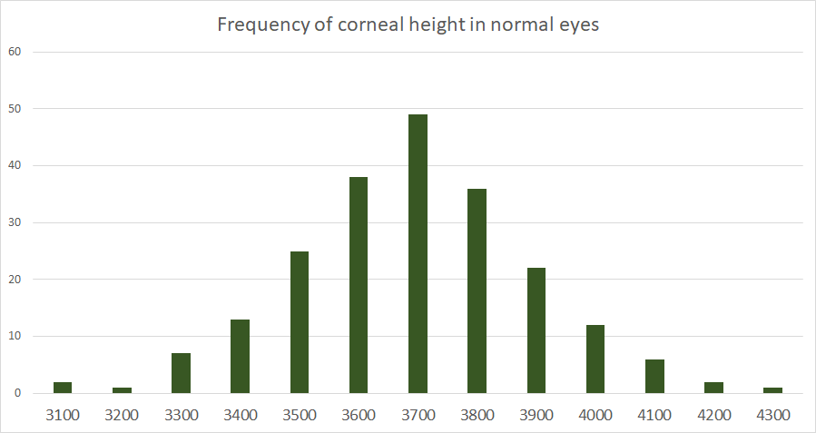 It is important to appreciate that there is considerable variation in shape and size of a normal eye. With the corneoscleral topographers that are now available such as the SMap and the Eye Surface Profiler, plus anterior OCT topographers, these ranges can be better understood. Several studies have shown that the average sagittal height of the cornea is around 3750 microns when measured at a 15mm chord. However, the spread of these measurements in normal eyes can vary 600 microns either side of this mean (Fig 1.).